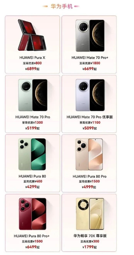 直板旗舰机型方面,Pura 80系列部分机型最高优惠1500元。Pura 80 Pro的12GB+256GB版本现价4299元;定位更高的Pura 80 Pro+,16GB+512GB版本则由7999元降至6499元,影像实力在同价位段中显得尤为突出。Mate 70系列同样参与活动,其中Mate 70 Pro+的16GB+512GB版本从8499元下调至6699元,降幅达到1800元,是一款表现均衡的全能旗舰。