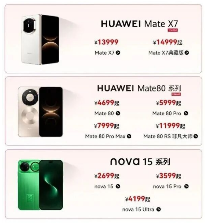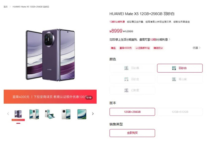 其中最引人注目的当属折叠屏旗舰Mate X5。其12GB+256GB版本售价由12999元调整至8999元,降幅高达4000元,堪称此次活动的“价格杀手”。而同系列更新一代的Mate X6也有大幅让利,12GB+256GB版本从12999元降至10999元,虽比X5略高,但在铰链工艺、芯片性能和机身轻薄度上均有提升。
